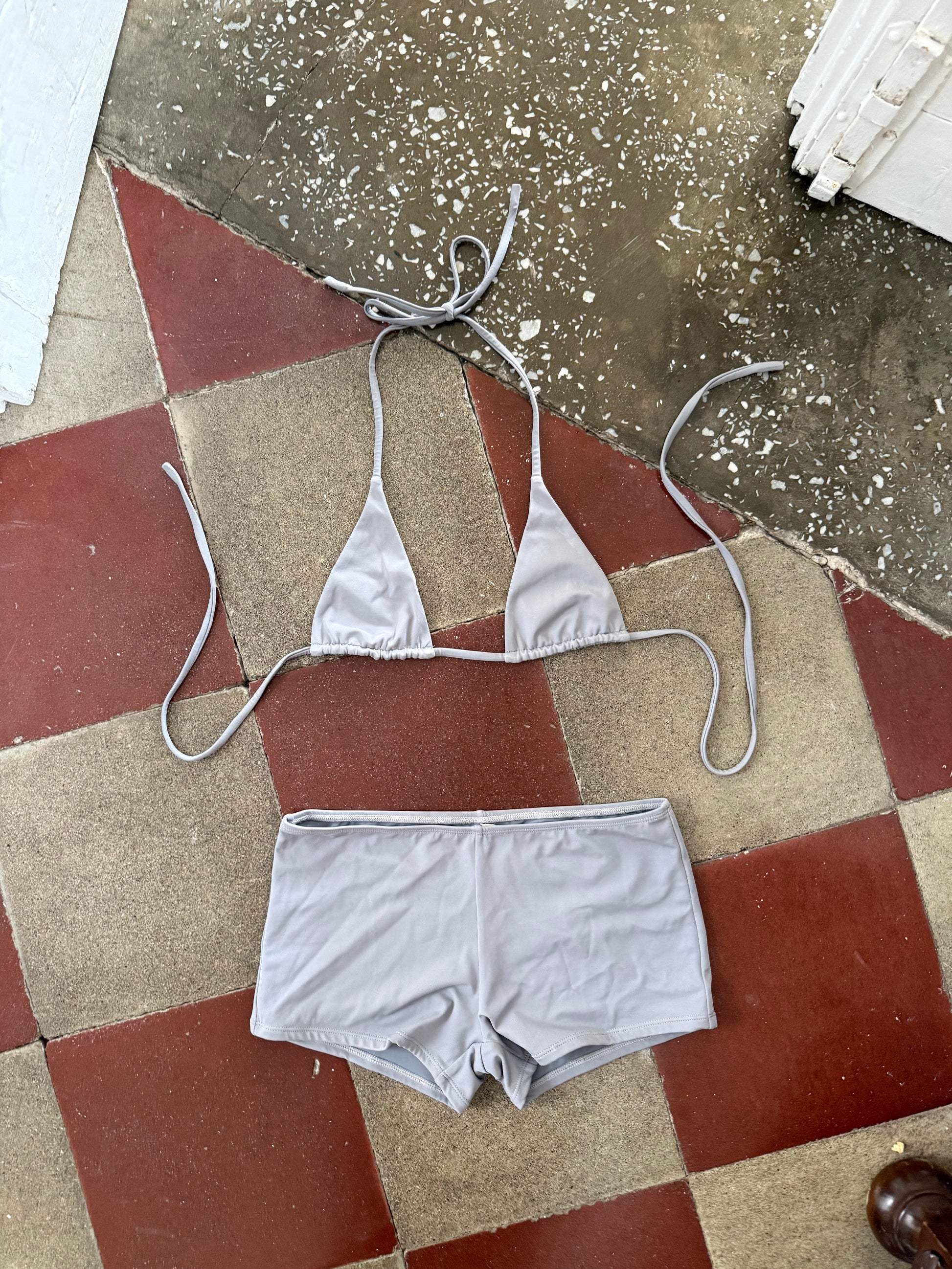 Triangle bikini top in matte stone grey. Adjustable neck and back ties. Fully lined.